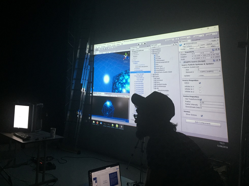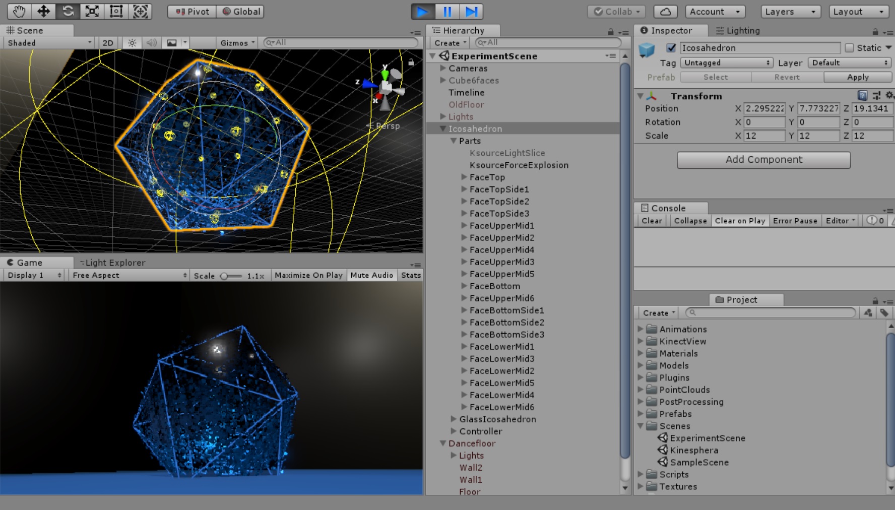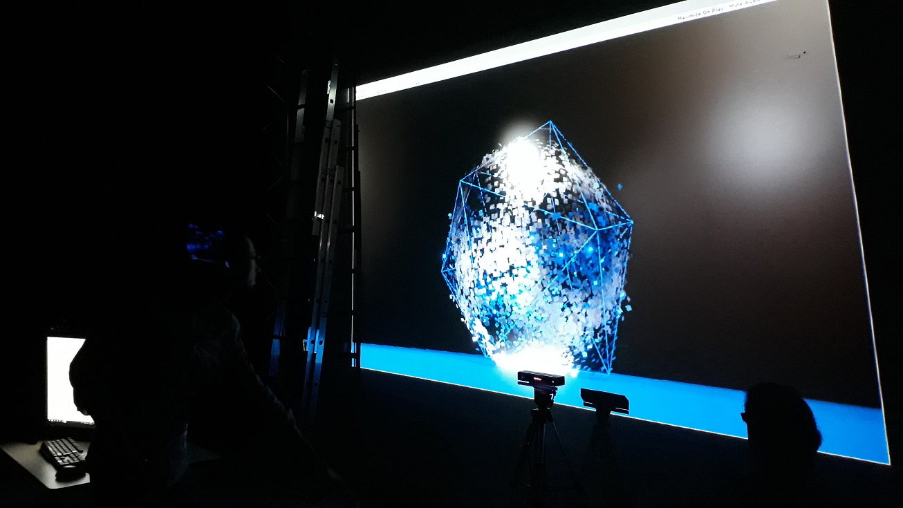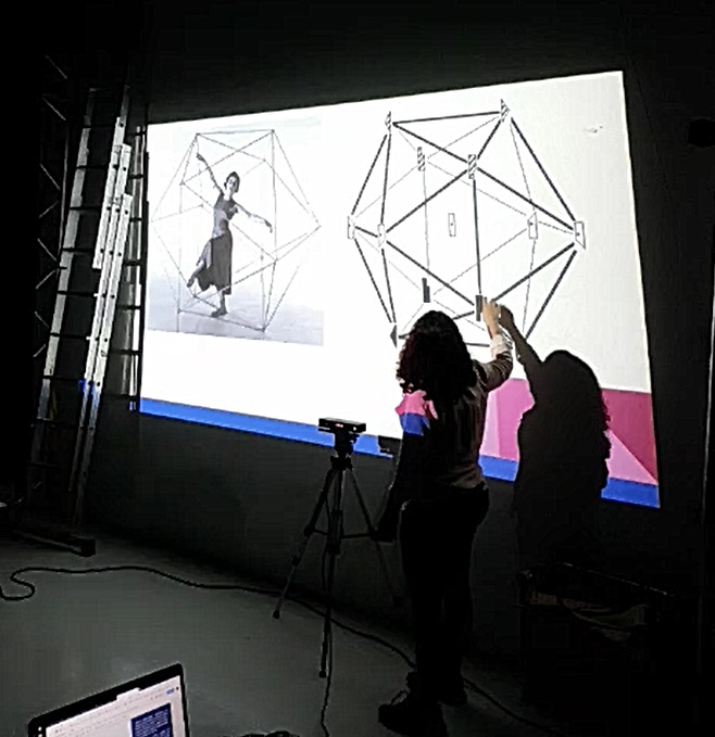 Kinexperience immerses the public right into Laban’s dance framework by wrapping a full human-sized virtual icosahedron around the person’s body. The icosahedron reacts to the motion of hands and feet triggering visual effects like trace lighting or particles explosion, giving the dancer feedback and insight into its own spontaneous practice.